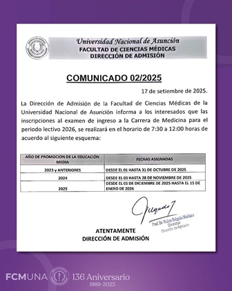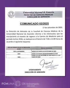 La Dirección de Admisión de la Facultad de Ciencias Médicas de la Universidad Nacional de Asunción informa a los interesados que las inscripciones al examen de ingreso a la Carrera de Medicina para el periodo lectivo 2026 se realizarán en el horario de 7:30 a 12:00 horas de acuerdo al siguiente esquema:
