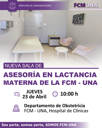La Facultad de Ciencias Médicas de la Universidad Nacional de Asunción (FCM-UNA), a través del Departamento de Obstetricia dependiente de la Dirección Asistencial del Hospital de Clínicas, invita a participar de la inauguración oficial de la nueva Sala de Asesoría en Lactancia Materna.