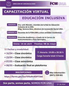 La Facultad de Ciencias Médicas de la Universidad Nacional de Asunción (FCM-UNA) llevará a cabo la capacitación virtual denominada “Educación Inclusiva”, orientada a fortalecer las competencias pedagógicas de docentes en el abordaje de entornos educativos más equitativos e inclusivos.